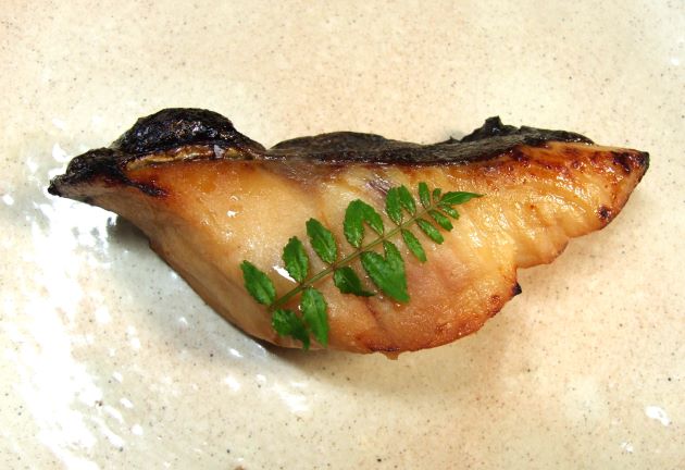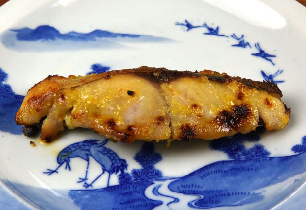![クリックで拡大表示]() アイブリの祐庵焼き(幽庵焼き) 三枚に下ろし切り身にして、水分をよく切る。ここで振り塩をして少し置いてにじみ出た水分を拭き取る、という工程はやってもやらなくてもいい。これをしょうゆ・みりん・酒同割りの地につけ込んで焼き上げる。適度に身が締まり、本来のうまさにしょうゆなどのうま味が加わってとても味わい深い。クリックで閉じます アイブリの祐庵焼き(幽庵焼き) 三枚に下ろし切り身にして、水分をよく切る。ここで振り塩をして少し置いてにじみ出た水分を拭き取る、という工程はやってもやらなくてもいい。これをしょうゆ・みりん・酒同割りの地につけ込んで焼き上げる。適度に身が締まり、本来のうまさにしょうゆなどのうま味が加わってとても味わい深い。クリックで閉じます![]()