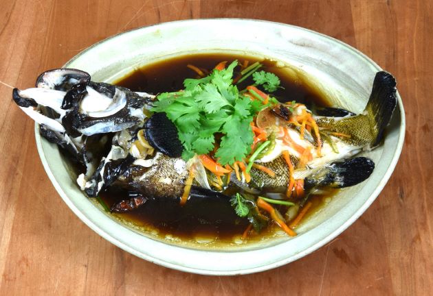 アオノメハタの蒸し魚(清蒸) ハタ科の魚がなぜ高いのかがわかる料理法、それは蒸すだ。ていねいに水洗いする。特に頭部や鰭下などは徹底的に取る。適当に切れ目を入れてにんにく、ねぎ、しょうがなどを乗せて15分前後強火で蒸す。蒸し上がったら取りだし、タレ(中国しょうゆ、辛み調味料、少量の魚醬、紹興酒を会わせて一煮立ちしたもの)に蒸したときに出た汁を加えて煮立てる。このタレをかけまわし、刻みねぎ、しょうがのせん切り、にんじんなどを乗せて、煙が出るほど熱くした油をかける。酒よりもご飯がほしくなる。非常にうまい。
