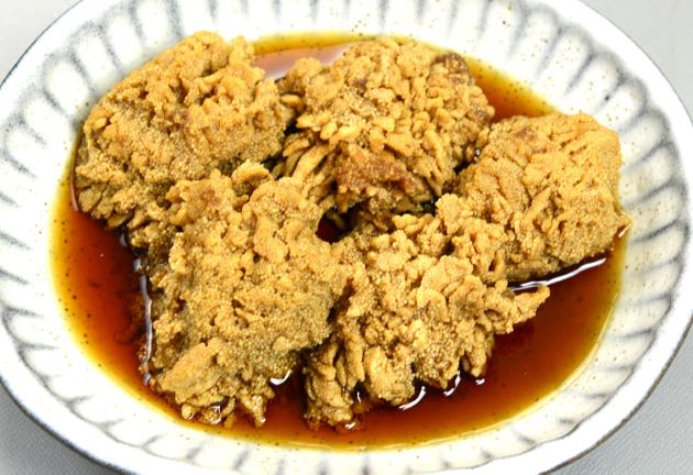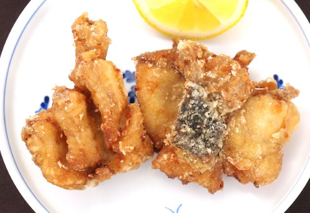 アオミシマの唐揚げ 中骨と頭部を取っているので、丸ごとかぶりつける。揚げると硬く締まるのが難点ながら、嫌みがなくそれなりに食べられる。いちばん無難な食べ方かも。水洗いして三枚に下ろす。身側から皮側に切れ目を入れて、片栗粉をまぶしてじっくりと二度揚げする。クリックで閉じます![]()