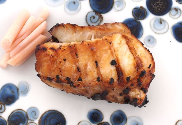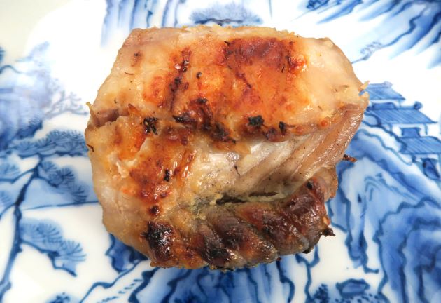アオミシマの幽庵焼き 身自体に味がないのを調味料が補っている。少し寝かせているので、硬く締まらず柔らかい。嫌みのない分、調味料とケンカしない。水洗いして三枚に下ろす。これを酒・みりん・醤油の地に数時間漬け込んで焼き上げる。クリックで閉じます![]()