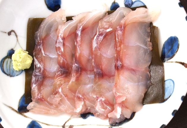 アオミシマの刺身 活魚なので薄くそぎ切りにしてもやや硬い。味はあまり感じられないものの、食感が心地よい。嫌みがなくおいしいと感じるかも知れない。あまり味がないのでコチュジャン酢とかごま油と塩で食べるとおいしく食べられる。水洗いして三枚に下ろす。腹骨と血合い骨を取り、皮を引き薄く切る。クリックで閉じます![]()