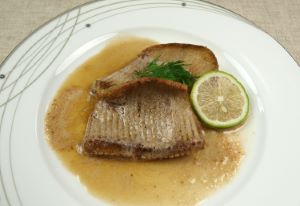 アカエイのムニエル フレンチではエイのムニエルは定番的なもの。ゆっくり熱を通すと表面がこんがりとして、なかがジューシーになる。ここでは鰭の皮をむき、塩コショウする。小麦粉をまぶしてじっくり香ばしくソテーする。仕上げにバターで風味づけ。表面の香ばしさと鰭のこりっとした食感があいまって実にうまい。