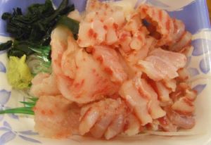 洗い 山口県北浦(日本海側)でしばしば見かけるもの。鰭などの皮を剥き、縦方向に切り、冷水でしめる。