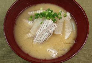 みそ汁/福岡県豊前地区 アカエイのみそ汁は日本各地で食べられている。実際に作ってみたら、旨みのある汁、そして軟骨のコリコリとした食感があって絶品だった。和歌山県、大阪府などでも同様。『聞き書 福岡の食事』(農文協同)