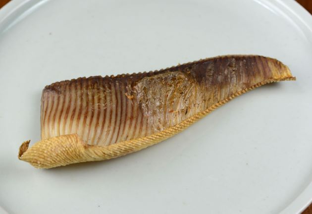 アカエイの鰭の干もの(えいひれ) 鰭の部分の干ものは本種の定番料理である。左右の薄い部分を強めに干すと軟骨の食感、その間の筋肉のうま味が同時に楽しめる。鰭を切り落とし、皮を剥く。水分をよく拭き取り、立て塩に5分つける。つけすぎると塩辛くなる。やや強めに干し上げる。