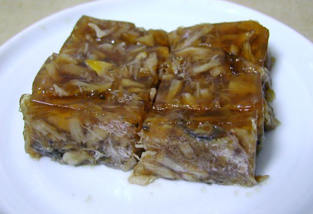 アカエイの煮こごり 軟骨や筋肉にゼラチン質を多量に含んでいるため、煮つけを冷やすと見事な「煮こごり」ができる。これを翌朝、炊きたてのご飯にのせて食べると、まことにうまい。アカエイで作る煮凝りは魚類中最上級のおいしさだ。