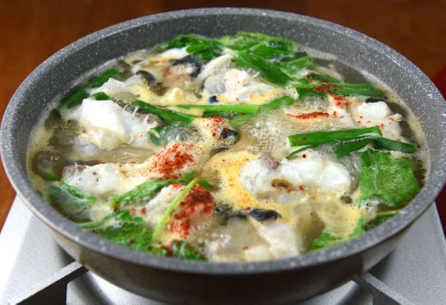 アカドンコの鍋 丸々一尾、いろんな鍋にしてみたが、この韓国風鍋がいちばんだった。韓国三陟市ではクサウオ科イサゴビクニンで곰치국(コムチクッ クサウオスープ)を作るが、本種で作った方が数段上だと思う。水洗いして適当に切る。ゆどうしして冷水に落として表面のぬめりなどを流す。これを煮干しだし、塩・酒のだしで煮ながら食べる。4月初めの個体は脂があり、煮ると水玉状の脂が浮き上がってくる。身自体にもうま味があり非常にうまい。