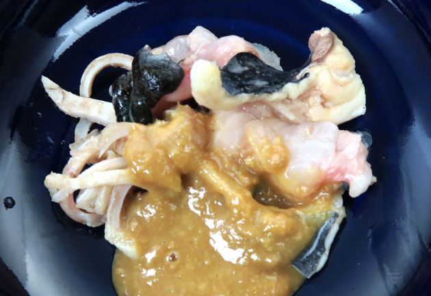 乳白色の身で熱を通すと縮む。肝、胃袋は非常に美味。栄養
