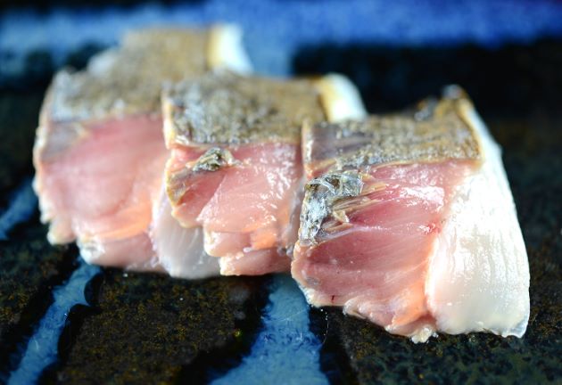 アカナマダの焼霜造 水洗いして鰭筋の部分を切り取る。身と鰭筋を半々にして皮をあぶり、冷凍庫で短時間皮を落ち着かせて切りつける。鱗はついたままだが柔らかく炙ると気にならなくなる。深みのある味わいで美味。クリックで閉じます![]()