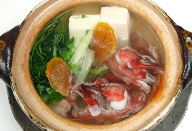 アカハタのちり鍋 水洗いし、これを適宜に切り、湯通しして冷水に落として残った鱗やぬめりを流す。これを昆布だしに酒・塩で味つけしただしで煮ながら食べる。実にうま味豊かな汁になり、身も甘みがあり適度にしまっていて美味である。クリックで閉じます![]()