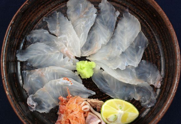 アカハタの薄造り(刺身) 活魚を締めて、水洗い、下ろして半日ほど寝かせて、刺身にしたもの。まだ身は硬くてうま味も薄い。できるだけ薄く切ることで、心地よい食感やほんのりとした甘味を楽しむもの。基本的には下ろして1日以上寝かせたほうがおいしい。クリックで閉じます![]()