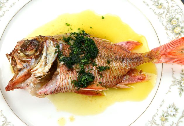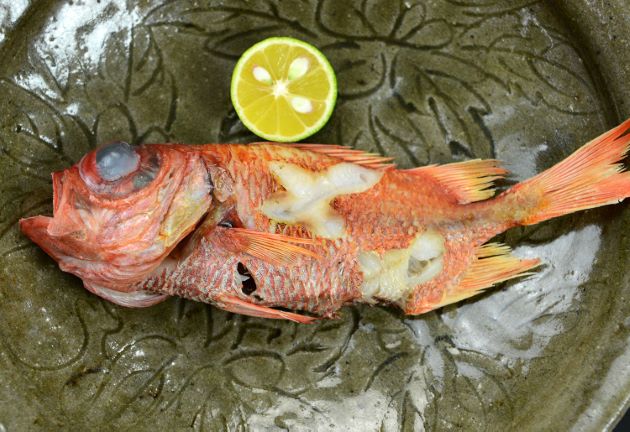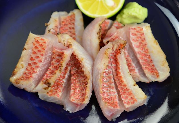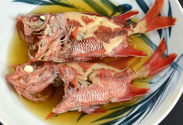 アカマツカサの煮つけ 非常に硬くて取りにくい鱗を取ると、厚く強い皮がある。この皮がうまいのである。水洗いして湯通しする、冷水に落とし残った鱗とぬめりを流す。水分をよくきり、酒・醤油・水をわかした中で煮る。みりん、砂糖で甘味を加えてもいい。適度に身が締まり、身離れがいい。煮汁とからめながら食べるととてもおいしい。