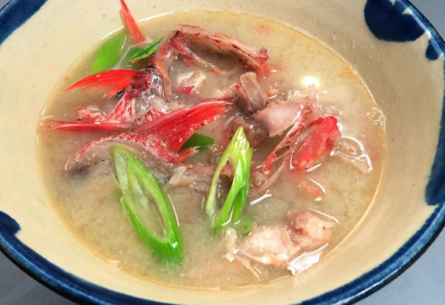 アカマツカサのみそ汁 ここではあらと肝を使ったが、1尾丸ごと使ってもいい。あらなどを集めて置く。湯通しして冷水に落として残った鱗やぬめりを流す。水分をよくきり、水から煮出してみそを溶く。うま味豊かな汁になる。骨などに付着した身にもうま味がある。クリックで閉じます![]()