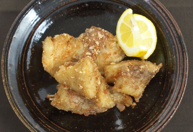 アコウダイの唐揚げ 腹の内臓を抱いた部分、尾に近いところなどを集めて置く。水分をよくきり。片栗粉をまぶしてじっくりと揚げる。皮目がむっちりして身はほどよく締まる。とてもうま味豊かでかみ応えのある味わいである。