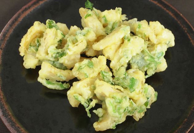 アコヤガイ貝柱のかき揚げ 基本的に生もしくは冷凍で貝柱の状態で流通している。塩水でざっと洗い、水分を切る。小麦粉をまぶして衣をつけて高温で短時間揚げる。揚げた香ばしさの中に強い貝のうま味が感じられる。甘味が豊かで非常に美味である。クリックで閉じます![]()