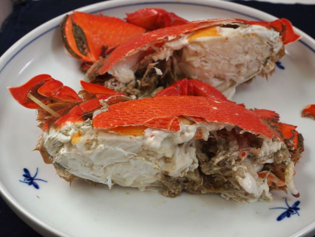 アサヒガニの塩ゆで 基本的な料理法はゆでるだろう。いちばん簡単な料理法だが熱が通ると赤く染まり、身が充実している。甲羅を割ると身が飛び出してくるように思えるほど、身が詰まっている。口に入れるとしまっていて、噛むと適度に繊維質にほぐれ、とても甘くておいしい。みそは濃厚でありながら後味がいい。雌の内子も実に美味。