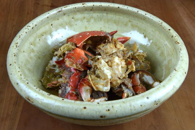 アサヒガニの煮つけ イセエビでいうところの「具足煮」だ。生きているものをぶつ切りにする。ハサミや脚は割る。これを酒・しょうゆ・みりんを合わせた地をからめながら火を通す。大形は少し水を加えると火を通しても焦げ付かない。身自体の甘味にしょうゆのうま味と塩分があいまってやたらにうまい。手づかみで食べて欲しい。クリックで閉じます![]()