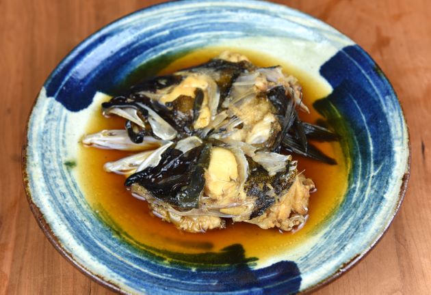 アズキハタの煮つけ ここでは頭部を使った。梨子割りにして、湯通しする。冷水に落としてヌメリや残った鱗をこそげ落とす。これを酒・醤油・水で煮る。マハタなどと比べると煮ても身が締まらず、身離れがいい。ほどよく繊維質呈味成分からくる甘味がある。クリックで閉じます![]()