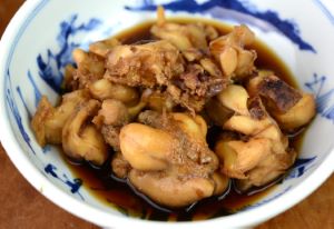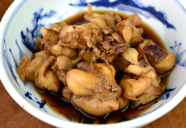 水洗いしてできるだけ皮を剥く。これを湯に1、2秒通して氷水に落とす。表面の皮をこそげ取り、切れ目を入れて適当に切る。