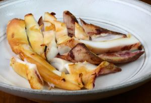 アブライカのムニエル 水洗いして外套膜を拍子木に切る。塩コショウして水分をとり、全粒粉(普通の小麦粉でいい)をまぶしてソテーする。今回は3月なので葉玉ねぎをソテーした。仕上げにバターを加えて風味づけする。ソテーしても硬くならず、バターとの相性もいい。パンに挟むとおいしいサンドイッチになる。クリックで閉じます![]()