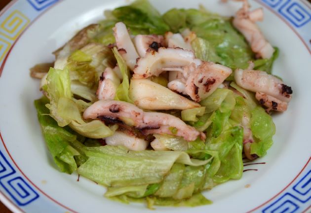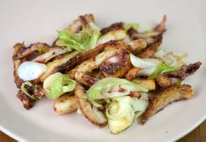 アブライカの炒め物 炒め物はイカ類のもっとも基本的な料理法である。水洗いして皮付きのまま切れ目を入れる。適当に切って、水分をきる。これを炒める。にんにく風味をつけた油に塩を加えた中、強火で炒め野菜を加える。写真はレタスだが、野菜はお好みで。クリックで閉じます![]()