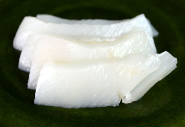 アブライカの刺身 水洗いして皮を剥く。皮がもろく、柔らかい割りに身から取りにくい。これをていねいに取り除く。包丁でこそげ取るようにするといい。これを刺身状に切る。柔らかくイカらしい風味もあり、複雑なアミノ酸が混じり合って甘味も感じられる。手間さえいとわなければとてもおいしい。クリックで閉じます![]()