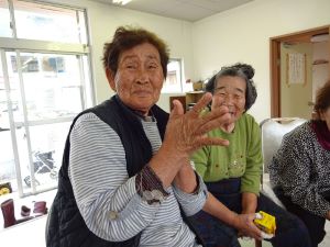 つくつく 両手のひらにアマオブネガイを挟んで手を前後させると「つくつく」と音がする。昔はこうやって遊んだものだと言って実践して見せてくれているのが、竹ヶ島の戎田里子さん。この遊びには様々な貝を使うが、遊び自体を「つくつく」という。[徳島県海部郡海陽町竹ヶ島]