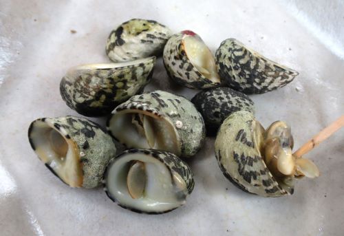 アマオブネガイの塩ゆで 採取したらザルなどに入れて流水でざくざくと洗う。塩水の中に洗ったアマオブネガイを入れて火をつける。数分で火が通るので火を消し、少し鍋止めする。クセがなくワタにうまみがあっておいしい。