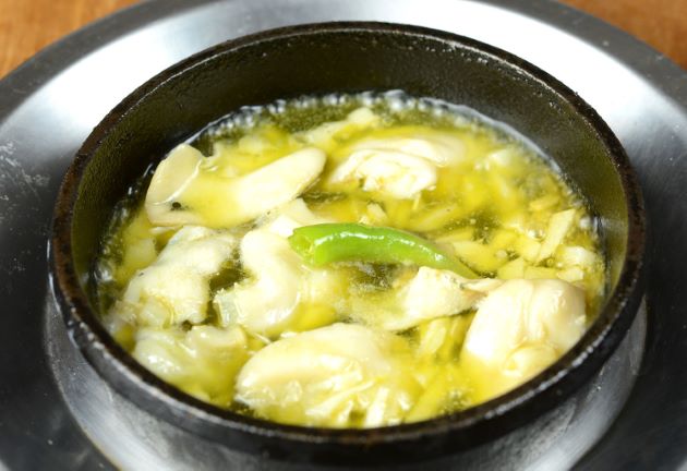アラスジサラガイのアヒージョ にんにく風味のオリーブオイルに、足の部分を絡めるようにして食べる。比較的穏やかで優しい味だが、甘味があって貝の風味がほどよいアラスジサラガイの足の味が生きる。もちろんにんにくとオリーブオイルも主役級だ。