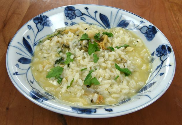 アラスジサラガイのリゾット 塩ゆでし軟体を外し、適当に切る。玉ねぎやニンジン、セロリなどをみじん切りにし多めのオリーブ油とにんにくでソテーして、洗わない米を加え、軽く炒める。ゆで汁、ローリエを加える。米が柔らかくなってきたら軟体を戻す。ハーブ類はディルなど。香辛料もコショウして味をととのえる。