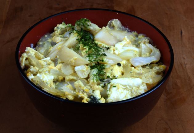 アラスジサラガイの卵とじ丼 卵との相性がいい。むき身にして適当に切る。ワタは外しても外さなくてもいい。ワタがあると濃厚な味になる。酒・みりん・しょうゆ・水(カツオ節出しでも)を合わせたものでねぎか玉ねぎなどを煮て、切った軟体を入れて五分通り火が通ったら卵でとじる。野菜、とじ加減はお好みで。