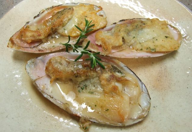 アラスジサラガイのワイン蒸し 酒蒸しにして美味。オリーブオイルにニンニクの風味づけをして、本種を投入。ワインを振りかけて中火でゆっくり蒸し煮にしていく。必ずフランスパンを用意すること。