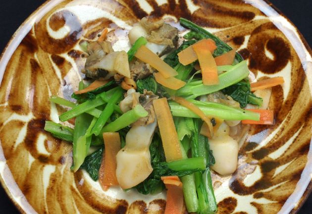 アラスジサラガイの野菜炒め 要するに肉の代わりに入れるというもの。剥き身にしてよく砂を落とし、野菜炒めにする野菜と炒めて塩コショウで味つけした。実にうま味の強いエキスが出て野菜とからんでおいしい。北海道白老などでは朝ご飯に食べたと言うがわかる気がする。