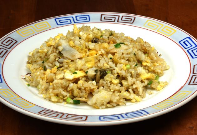 アラスジサラガイの焼き飯 肉などの代わりに剥き身を使うだけだ。剥き身にして適当に切っておく。焼き飯(炒飯)の具である。ネギなども切る。フライパンに油を熱し、溶き卵を炒めてご飯を加える。油がご飯に馴染んだら、貝の身を加えて強火で炒めて、味見して塩コショウする。ネギを加え、仕上げに醤油の風味を足す。