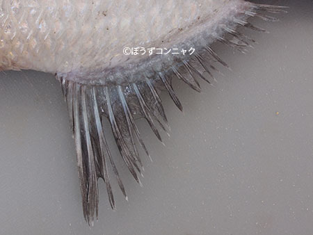 42cm SL戦後になる。2本の髭がある。側へんし全体に黒っぽい銀色。側線上方横列鱗は12-16。背鰭に顕著な黒い部分はない。[鹿児島県産。42cm SL、1.9kg]
