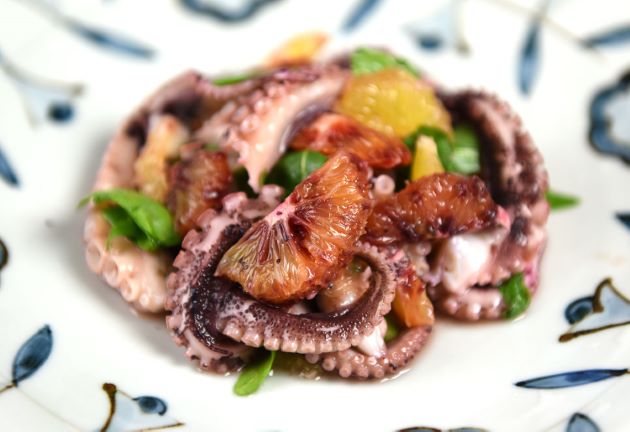 イイダコと柑橘類のマリネ 短時間軽くゆでたイイダコをまだ熱いうちに、ワインビネガーと塩を合わせた地につけ込む。熱が冷めてきたら柑橘類(ここでは黄金柑、ブラッドオレンジ)とルッコラなどを合わせて和える。タコには柑橘類が非常に合う。クリックで閉じます![]()