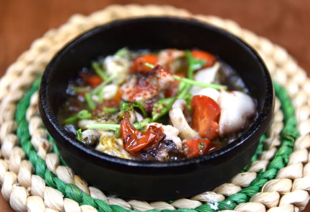 イイダコのアヒージョ 腹部(内臓などの入った頭に見える部分)をゆでたものを適当に切る。耐熱性のあるものに油(ここではグレープシードオイルだけどなんでもいい)、にんにく、イイダコ、トマトを入れて火にかける。仕上がりにパセリなど青みを振る。クリックで閉じます![]()