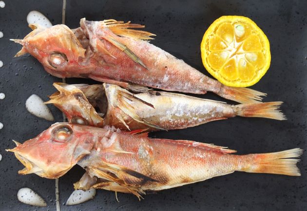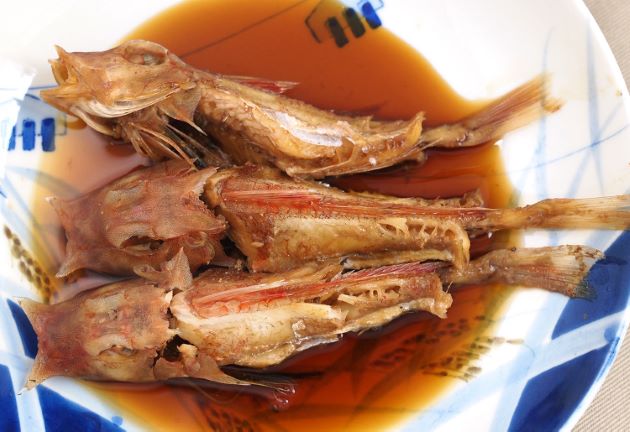 イゴダカホデリの煮つけ 長崎県長崎市茂木では本州の煮つけをカナガシラ同様節分に食べるという。このような鱗のきつい、骨張った魚は液体を使う料理が向いているのもあると思う。水洗い。鱗はとっても取りきれないので、熱湯に通して手でこそげ落とす。水分をよくきり、酒・醤油・砂糖・水を煮立てた中に入れて煮る。白身で上品ではあるがうま味豊かで身質がよく味わい深い。非常に美味だ。