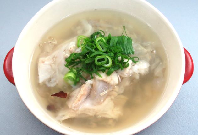 イサゴビクニンの中華風スープ 皮を剥き、適当に切る。肝は美味なので取って置く。汁にするのがいちばんだとは思うが、切り身だけではうま味に欠ける。中華スープやカツオ節出し、煮ビシだしで煮るといい。とろとろと寒天のように柔らかく、くせのない味わいだ。