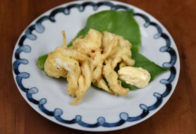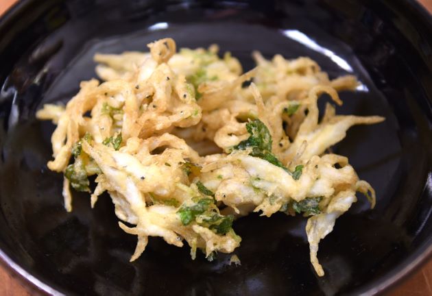 イシカワシラウオのかき揚げ(白魚のかき揚げ) 春たけるに従い大きくなる。これを春野菜である三つ葉やせりを合わせてかき揚げにする。さーっと水洗いして水分をよくきる。小麦粉をまぶして、小さな容器に入れる。衣、野菜を入れて混ぜて適当な量を油に放ち揚げる。なんとなく春らしい香りがする。微かな苦みもよい。