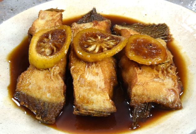 イシガレイの揚げ煮 野締めで鮮度がイマイチなものは単に煮つけにしても味気ない。こんなときは一度唐揚げにしてから煮つける。水洗いして適当に切る。水分をよくきり、片栗粉をまぶして数分揚げる。これを酒・砂糖・醤油・水を合わせた甘辛い煮汁で短時間煮上げる。揚げることにより身は適度に引き締まり、香ばしさも加わる。これと煮汁の味が相まって非常にうまい。クリックで閉じます![]()