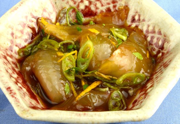 ハスの焼き切り(やきぎり) 三枚に下ろして皮目を強めにあぶり、刺身状に切り、手に塩をまぶして叩く。次ぎに柚子酢をてにつけてたたき、玉ねぎのスライスをのせる。コウロ(イシガキダイ)、グレ(メジナ)、ヒラソウダ、カツオなどでも作る。このまま玉ねぎと一緒に食べてもいいし、にんにくや青じそ、ねぎなどで食べてもいい。[徳島県海部郡海陽町宍喰、熊本県天草市]クリックで閉じます![]()