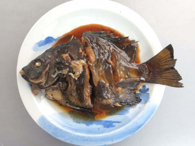 イシダイの煮つけ(兜煮) 定置網などでもとれるが、浅場の刺し網などによくかかる。漁師さんの基本的な食べ方は刺身か煮るかだ。しょうゆ味の煮つけはご飯にも好相性だし、兜を使っても、小振りのものを丸ごと煮ても、丸ごと無駄なく食べられる。上品な身ならがら煮ても硬くしまらず、しっとりとして甘味がある。クリックで閉じます![]()