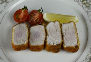 イソマグロのフライ 背の部分を使ってフライを作る。背の部分は適当に切り、塩コショウする。小麦粉をまぶし、衣(卵・小麦粉・水)をからめてパン粉をつけて高温で短時間揚げる。揚げたては中心部が生の状態が好ましい。揚げても硬く身が締まらず、エキス分が豊かで実にうまい。ご飯に合う。クリックで閉じます![]()