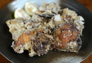 イソマグロの唐揚げ かまの部分を唐揚げにした。かまの部分を適当に切り、水分をよくきる。片栗粉をまぶしてじっくり二度揚げにする。マグロ類よりも骨が柔らかいので、揚げると骨まで食べられ、身は鶏肉のように締まりとても味わい深い。クリックで閉じます![]()