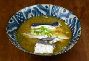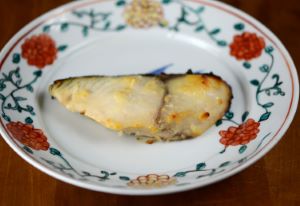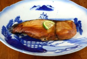 イソマグロの西京漬け(みそ漬け) 白みそ(西京みそ)に漬け込んだもの。三枚に下ろして切り身にする。切り身に振り塩をして少し置き、表面に出て来た水分を拭き取る。これを白のあらみそ(すっていないもの)、みりんを合わせた中に漬け込む。1日以上つけて焼き上げる。みその香ばしさと、ほどよく締まった身で非常に美味。クリックで閉じます![]()