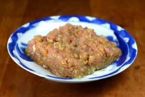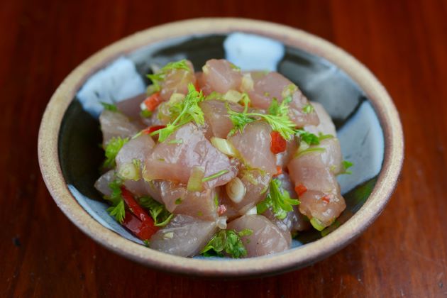イソマグロのポケ ポキとも。ハワイの料理だが、太平洋の島々で広く作られている。細かく切り、好みの野菜、ネギと合わせてごま油と醤油で味つけする。和でもない韓国風でもない不思議な味だが、実に味わい深い。ご飯にも合う。クリックで閉じます![]()