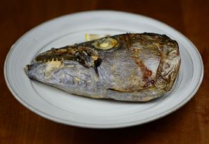 イソマグロの塩焼き 頭部の構造はマグロとはまったく違っている。骨が薄くて硬いマグロとは違い、それほど硬くなく溶くの方の周りなど柔らかいくらいだ。要するにマグロ類よりも兜焼きにしておいしいということだ。兜を梨子割りにして振り塩をする1時間以上寝かせて焼き上げる。非常においしい。クリックで閉じます![]()