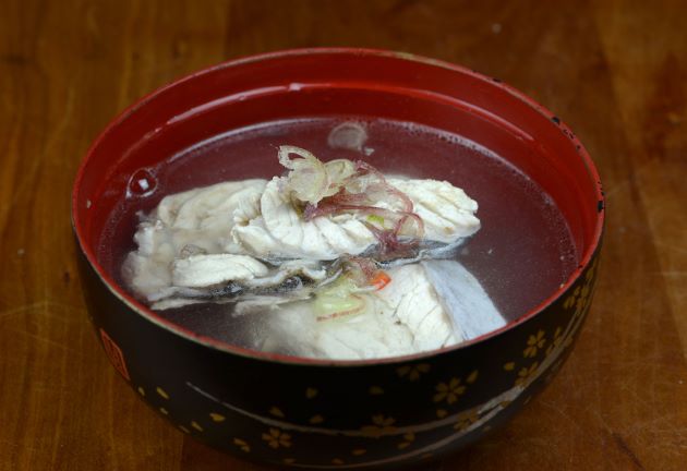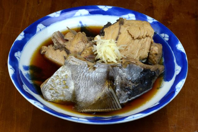 イソマグロの煮つけ かまと腹身の一部を煮つけに。かまなどは湯通しして氷水に落として表面のぬめりや残った鱗などを流す。水分をよくきり酒・醤油・水を煮立たせた中で煮上げる。みりん、砂糖で甘味をつけてもいい。とても身離れがよく、身自体に甘味がありとてもおいしい。煮汁なども味がいいので、終いには骨湯を。クリックで閉じます![]()