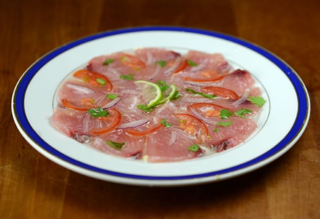 イソマグロのカルパッチョ 背の部分を使って作る。皿にニンニクをなすりつける。すりおろしたニンニクの場合はオリーブオイルと混ぜて伸ばす。塩コショウした上にできるだけ薄く切った身を並べて行き、並べ終わったら上から軽く馴染ませるようにたたく。上からも塩コショウして好みの野菜などを散らし、オリーブオイルをかける。クリックで閉じます![]()